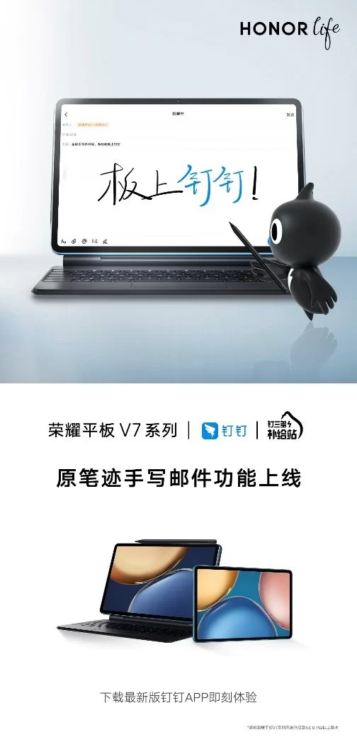 此次荣耀平板V7系列上新的“原笔迹手写邮件”为荣耀平板与钉钉联合开发,是钉钉为荣耀平板V7系列独家定制的功能。通过荣耀平板V7系列所适配的Magic-Pencil 2触控笔,用户在使用钉邮时,可以直接使用原笔迹回复邮件,实现更为自由的表达,同时可以插入手绘图表、思维导图、创意草图等,让思维的灵感挥洒自如,同时也极大的简化了键盘录入的繁琐,提升了办公效率。据荣耀工作人员介绍,双方还将于近期在荣耀杭州星光国际广场店联手打造盛大的线下体验活动,并准备了丰厚的奖品,欢迎当地用户去实际体验“原笔迹手写邮件”这一新功能。
