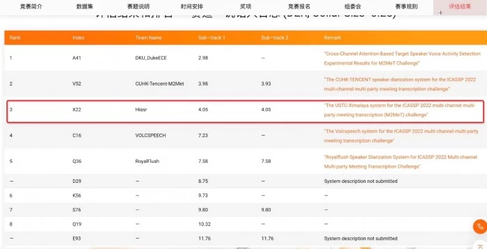 而M2MeT挑战赛是ICASSP2022信号处理大挑战(Grand Challenge)之一,包括说话人日志和多说话人语音识别两个赛道,旨在进一步促进该领域的深入研究。喜马拉雅和中国科学技术大学合作在说话人日志赛道取得了4.05% 的日志错误率(DER)结果,名列第三位。 第一、第二名分别由昆山杜克大学的李明教授团队(2.98%)和腾讯-香港中文大学团队(3.98%)获得。
