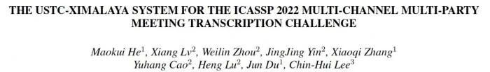 近日,由国际音频顶级会议ICASSP(International Conference on Acoustics, Speech, and Signal Processing,国际音频、语音与信号处理会议)联合阿里巴巴发起的ICASSP 2022多通道多方会议转录挑战赛(M2MeT)落下帷幕,喜马拉雅智能语音实验室和中国科学技术大学合作,在说话人日志赛道获得第三名。同时,相关论文已经被ICASSP 2022收录,并受邀于今年5月份在新加坡举办的线上/线下会议中进行展示,这是今年喜马拉雅的第二项研究技术成果得到ICASSP 2022的认可。