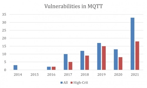 2014年至2021年,在MQTT协议中发现的漏洞数量