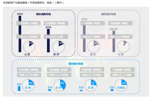 纵观全球,北美、欧洲、东南亚、印度四大板块组成了超过2.7万亿美金的市场。全球教育市场可大致分为三类:成熟市场、新兴市场与其它市场。成熟市场以北美和欧洲等老牌发达国家为代表,具有平均最高的购买力(北美2021年人均GDP约为6万5千美金,欧洲约为4万美金)以及可观的学龄人口数量。新兴市场包括印度、东南亚、非洲和拉丁美洲国家等,经济发展程度相比成熟市场较低,购买力较弱但增速明显。