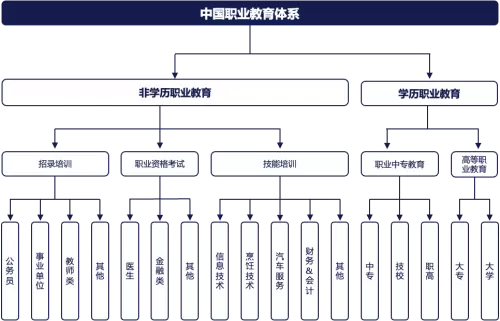 职业教育是指为了使受教育者具备从事某种职业或者职业发展所需要的职业道德、专业知识、技术技能和能力素质而实施的教育活动,可以分为学历教育(体制内职业教育)和非学历教育(市场化职业教育)。