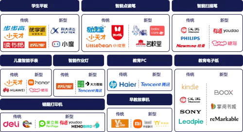 智能教育硬件赛道上的企业主要分为三大类:以步步高、读书郎和好记星等为代表的传统阵营;以华为、腾讯和字节跳动为代表的专门提供教育硬件类的平台类企业;以及以科大讯飞、网易有道为代表的智能化程度相对更高的先进市场参与者。