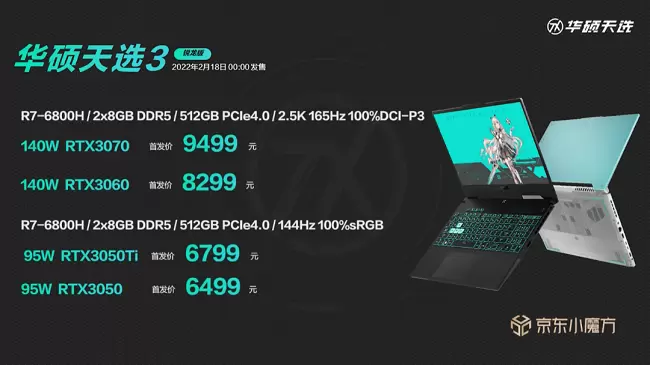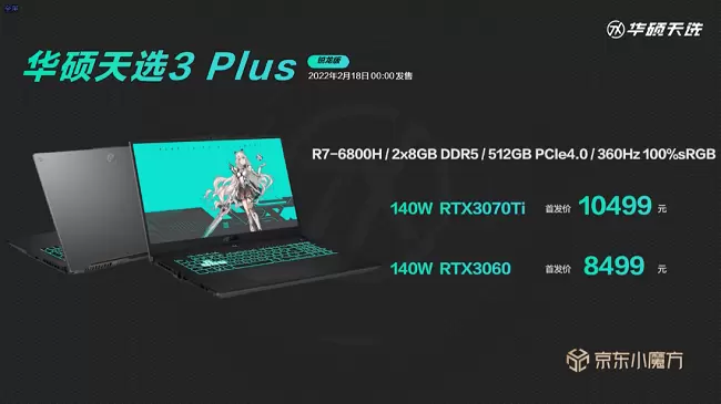 2月18日1:00,华硕天选3锐龙版将在#京东小魔方# 新品首发,此外新一代轻薄创作本天选air 2022也同步开售。天选3锐龙版全系搭载AMD锐龙7 6800H处理器,其中RTX 3070版本首发价9499元,RTX 3060版本首发价8299元,RTX 3050Ti版本首发价6799元,RTX 3050版本首发价6499元。RTX 3070Ti版本天选3 Plus锐龙版首发10499元,3060版本首发8499元。而天选air 全系搭载12代酷睿i7-12650H移动处理器,RTX 3070/3060/3050Ti/3050各版本对应价格分别为9999元/8999元/7999元/7499元。点击下方链接,可了解更多详情。