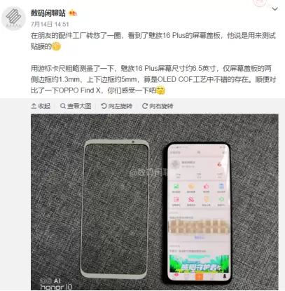 “窄边框”同样是属于魅族的符号,此前有数码自媒体@数码闲聊站 晒出疑似魅族16 Plus屏幕盖板与OPPO Find X的对比照,称魅族16 Plus的两侧边框仅1.3mm,上下边框约5mm,采用COF封装工艺,整机的屏占比相当不错。黄章也曾晒出魅族16真机照,显示其边框比小米8更窄。看来即使是18:9的屏幕比例,也没有妨碍魅族16屏幕视野、观感的提升。