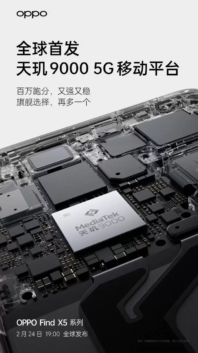 节后,手机厂商新机发布的步伐明显加快。OPPO今日官宣旗下OPPO Find X5 Pro天玑版将在2月24号正式发布,让众多网友翘首以盼的天玑9000首发终端终于要来了!同时,OPPO也在官微上公布了天玑9000终端的性能成绩:“百万跑分,又强又稳。旗舰选择,再多一个。”