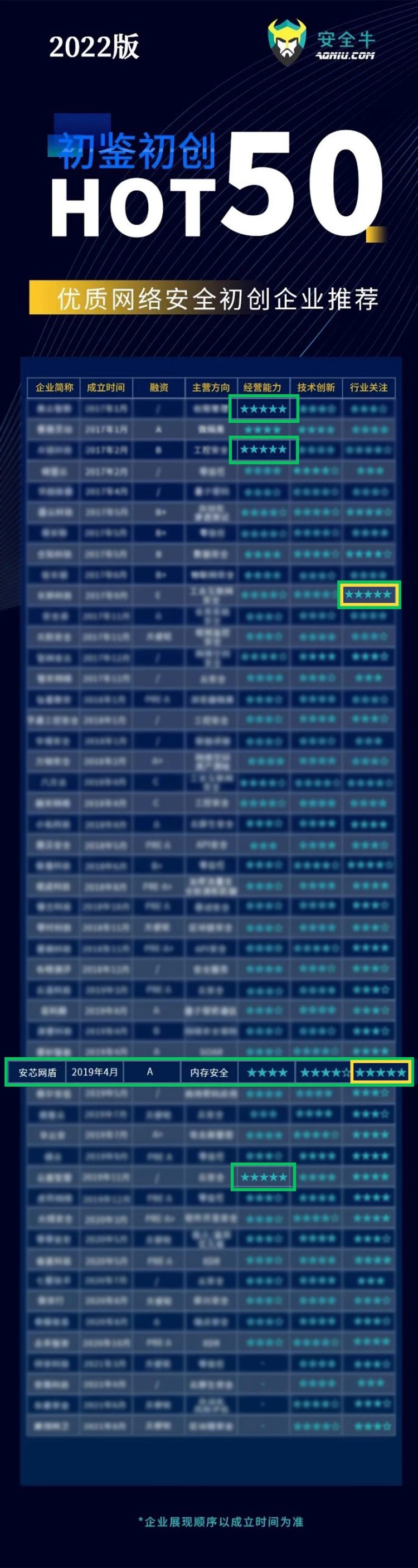 2022年2月11日,由安全牛发起的2022年度《初鉴初创 | 网络安全创业企业HOT50》研究报告正式发布,安芯网盾连续两年被列入网络安全初创企业HOT50,获评为优质网络安全初创企业。本次报告从企业经营能力、技术创新能力、行业应用价值三大维度,从107家安全厂商中筛选出50家优质厂商进行年度推荐。在本次推荐的50家优质企业中,三大评选维度含有五星推荐的企业仅有5家,安芯网盾是其中之一;在“行业关注”单一维度获得五星推荐的企业仅有2家,安芯网盾荣为其一。
