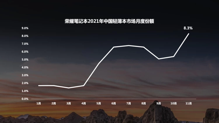 荣耀笔记本在轻薄本市场份额增至8.3% ,成为2021中国轻薄本市场增速最快品牌