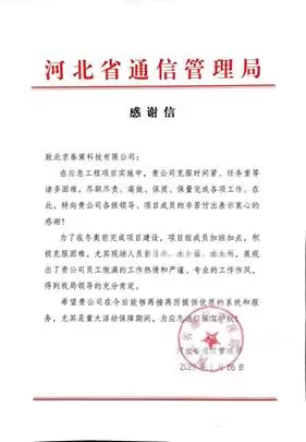 在河北省通信管理局致东方通的感谢信中,泰策科技的相关系统产品与服务品质、技术能力以及团队工作精神被予以高度认可。