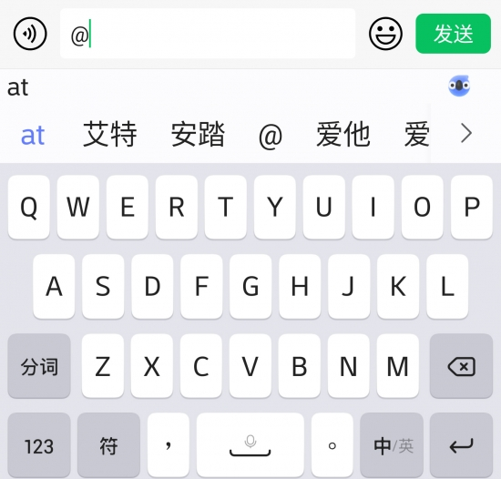当需要输入符号时,可以把符号视为汉字。比如@输入拼音首字母“a”和“t”,讯飞输入法就能提供字词和符号丰富的候选。从下图可看出,@符号也能被打出来。