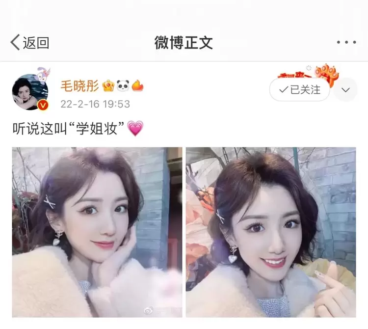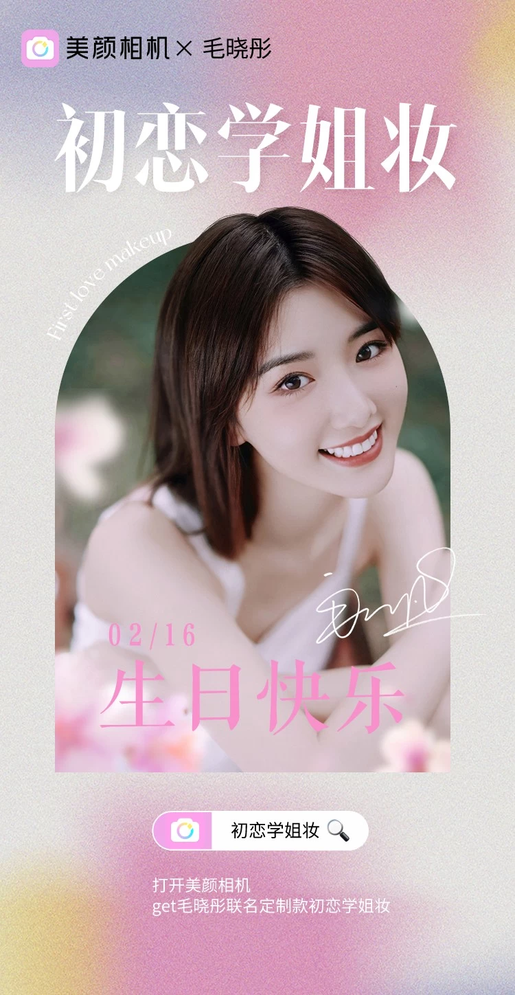 作为造型百变并且超会拍的艺人,毛晓彤在2月16日生日当天,联合美颜相机推出“初恋学姐妆”,并在微博上自拍营业,发布了“初恋学姐妆”的自拍plog,展现出自己甜美、温柔的一面。