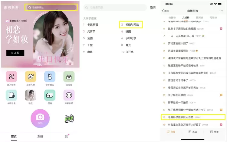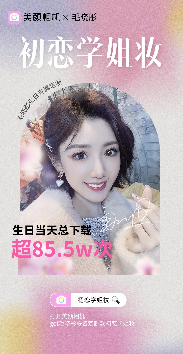 “初恋学姐妆”上线后,在毛晓彤的安利下,毛晓彤工作室、全球粉丝团的转发加持下,粉丝们纷纷打卡体验同款妆容,此后便迅速冲上了美颜相机和微博的热搜。据美颜相机官方数据显示,在毛晓彤生日当天,“初恋学姐妆”总下载超85.5万次,在社交平台涌现出大量校园氛围感大片。
