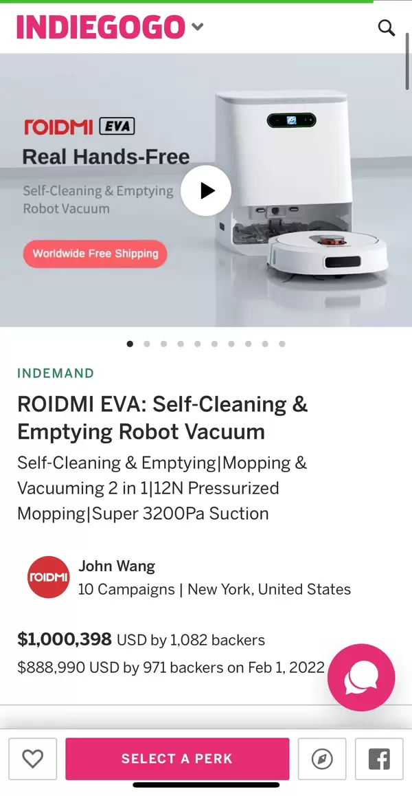 2月16日,睿米EVA真全能扫拖机器人在海外众筹平台Indiegogo众筹金额突破一百万美元,创下傲人纪录。
