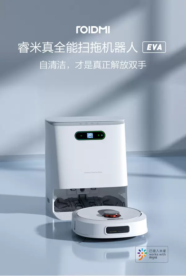 一直以来,睿米都想创造一个能够真正解放用户双手的扫拖机器人。EVA有全程自集尘和自动清洗拖布功能的整合,60天只倒1次灰,拖布脏了自己洗,这样用户就可以长时间省去倒垃圾和更换抹布的烦恼,生活更加便捷。此外,EVA还配备了4L大容量水箱,99%强效抑菌;99.9%抑菌尘袋,涡轮强速风干。EVA搭配了3种清洁模式,满足家庭全场景清洁需求。3200Pa大吸力、4寸180转/分钟高转速大拖布、12N加压仿生拖地,让灰尘污渍不见踪影。搭载了第4代LDS超感激光雷达,全场景避障脱困;20mm爬坡过坎,无惧家中门槛。连接米家APP,轻松为每个房间定制清洁模式,掌上清洁随心控;呼唤小爱同学,一句话安排清洁任务。总之,EVA可以让用户省时省心省力,真正做到解放双手。