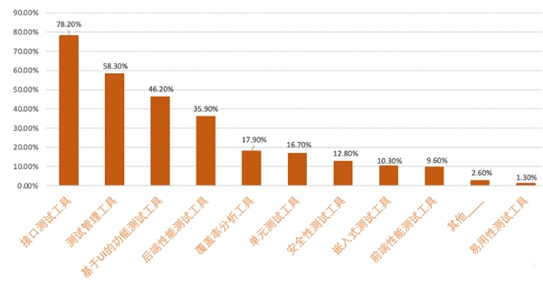现阶段自动化测试工具整体使用情况分布中,接口测试工具应用最为普遍,比基于UI的功能测试工具要高出32%。这也容易理解,微服务架构、面向接口的开发与应用是当今软件开发的一个主流趋势,接口测试自然成为主要的验证手段,而且接口测试也更容易实现自动化测试,如自动化测试的金字塔模型所展示的。1/3的测试人员会使用后端性能测试工具,但前端性能测试工具的使用情况要低不少,只有十分之一的人使用。