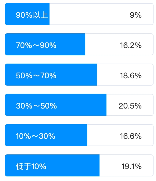 根据报告显示,自动化测试水平分布情况中,中位数最高,即 30~ 50%、50~70%自动化水平占比分别为 20.5%、18.6%。90%以上占比 9%,超过 4 年前 (2017年)的数据,那时只有 4%。4 年前大部分(超过50%水平的)已实现自动化测试占比32%,2021 年达到 43.8%,增长 11.8%。
