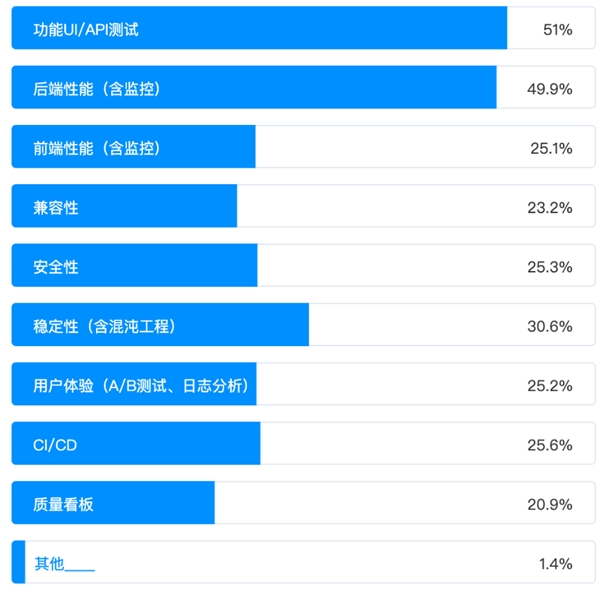 关于2022年测试团队希望在哪几个质量专项增加更多的自动化测试/工具的投入?首推功能 UI/API 测试,正好超过一半(51%),其次就是后端性能、混沌工程。前端性能、安全性、用户体验、CI/CD 都非常接近,占比 1/4 左右。