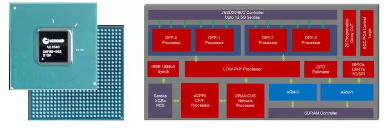 梅里UC1040是一款4T4R 4G/5G双模的DFE芯片,该芯片采用灵活可编程的ASIP(专用指令集处理器)技术构建,能够适应5G小基站产品的各种场景与需求。其中,前传接口能够灵活支持option7和option8的各种配置及数据格式,支持LOW-PHY处理以及IEEE1588及SyncE的同步定时功能。而且该芯片集成4个数字中频的收发通道,可以灵活配置成4T4R NR,4T4R LTE及2T2RNR+2T2RLTE多种组合模式。此外,芯片支持波峰因子消除(CFR)和可编程数字预失真(DPD)能够大幅度提高功率放大器的性能。芯片集成了8路JESD204B/C接口,可以对接国产化及常见的射频收发(Transceiver)器件。