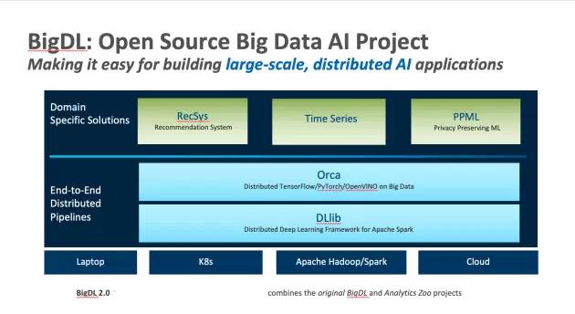 而针对上述难题,英特尔BigDL 2.0有着清晰的解决思路——提供一个统一的大数据架构,为分布式AI提供统一的端到端管道。如此一来,企业就可以在同一个集群、同一个应用内使用Spark等处理数据仓库中的数据。在此基础上,人们可以针对内存Spark Dataframes直接使用TensorFlow、PyTorch、OpenVINO等深度学习AI模型。Spark Dataframes是驻留在内存中的数据集,分布在整个集群上,客户可以透明地在分布式数据集上使用这些AI模型、AI算法——都在一个集群内,更重要的是,一个程序,只需一个工作流。
