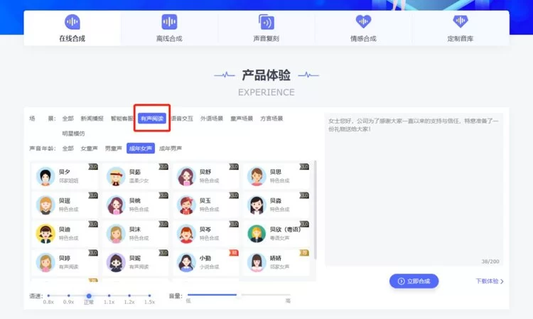 随着智能语音技术的进步,全新的AI合成声音越来越充满感情和表现力,不仅能够快速实现文字到音频的转换,尤其是针对长、难文本,语音合成能更有效地完成转化,提高有声书制作的效率,极大地节省了人力成本和时间成本。