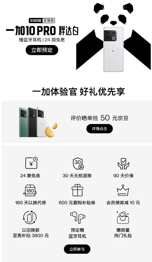 一加 10 Pro胖达白发布 加入京东一加体验官享受90天价保等权益