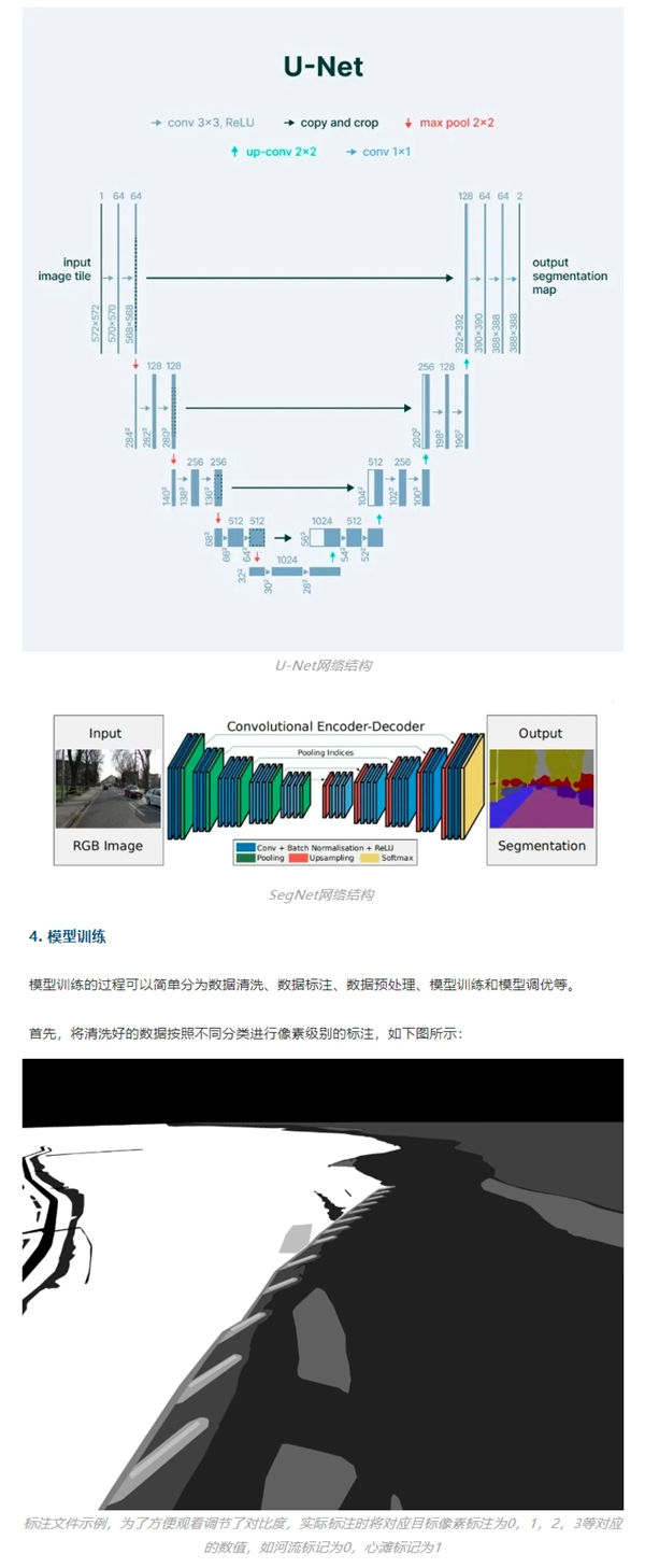 从上面图例中可以看出,需要划分出水域图像中不同类别的区域及大小(如河流、滩地、大坝区域),能够完成此任务的技术路线就是使用语义分割或实例分割,因为只有它们能够将水域图像中的每一个像素分割确定为不同类型,从而确定图像中每种类型区域的大小和位置,同时该任务又不需要区分每个类型的实例,因此最适合方案的就是使用语义分割。下面就为大家介绍一下语义分割的原理。