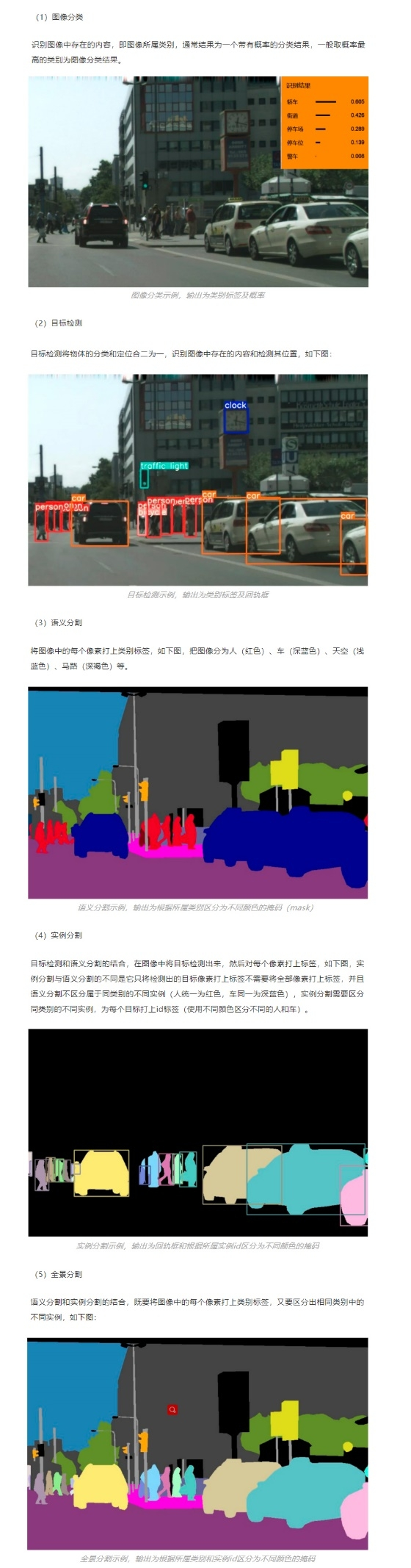 语义分割同实例分割(InstanceSegmentation )、全景分割(Panorama Segmentation)共同组成了图像分割(Image Segmentation)。当前人类对用计算机视觉解决的最重要问题就是图像分类(Image Classification)、目标检测(Object Detection)和图像分割,按难度递增。在传统的图像分类任务中,人们只对获取图像中存在的所有对象的标签感兴趣。在目标检测中,百分点科技尝试在边界框的帮助下了解图像中存在的所有目标以及目标所在的位置。图像分割通过尝试准确找出图像中对象的确切边界,将其提升到一个新的水平。接下来用图例简单介绍以下它们分别是如何工作的: