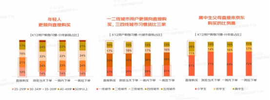 除产品本身和消费者多样需求外,区域差异也在影响着用户购买偏好。得益于地理位置优越性,一二线城市用户更倾向直接购买,而三四线用户则习惯货比三家后再下单。此外,从购买渠道来看,72%的高中生父母更喜欢直接前往京东下单,以便享受更好的购物体验。