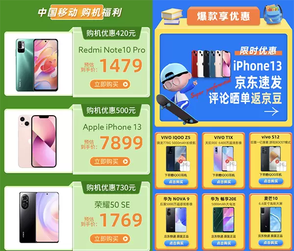 此外,京东还联合三大运营商针对当下热销的机型推出了优惠活动。如中国移动用户购买iPhone 13系列至高优惠500元、OPPO Reno6 Pro至高减980元;中国电信用户购买荣耀60系列至高直降300元、华为nova 9至高直降400元、iQOO 9直降200元等等优惠,想要优惠购机的用户可以关注一下中国移动、中国电信、中国联通京东自营店哦。