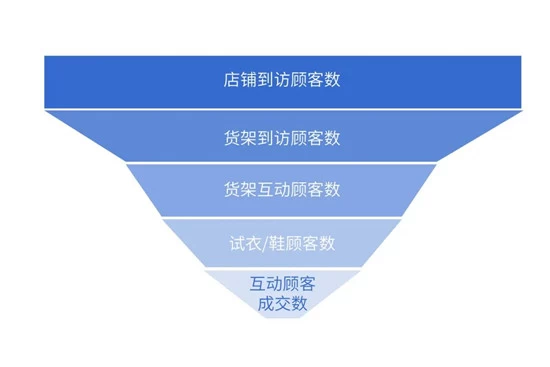 对于不同的细分行业,细分指标会有所差异,形成特有的转化漏斗图。如在鞋服行业,试衣率与试衣时长会作为店铺转化能力指标;在商超行业,商品拿起率,拿起时长会作为店铺转化能力指标;在百货行业,关注客流会作为进店客流的指标。如图是某鞋服品牌在成交率环节的转化漏斗。通过漏斗的表现与目标值(Target)的比较可以引导经营者进行 MOT 的选择与管理。