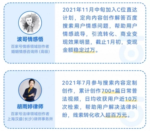 除了带货,搜索能够为创作者的服务带来精准的获客。情感领域创作者“波哥情感悟”是一位高级婚姻情感咨询师,他从2021年11月中旬加入“C位直达”内容创作,解答百度搜索用户情感问题,帮助用户情感疏导,截至今年1月初,账号变现金额稳定过万。