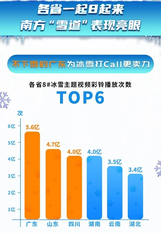 这个冰雪春节,既能传递祝福、又能抢红包互动的冰雪视频彩铃成为全国统一“异地拜年神器”。数据显示,观看8#冰雪视频彩铃异地通话数量达7.9亿次,最远的一通视频彩铃异地通话从海口到大兴安岭,跨越4335.7公里。而在8#红包雨活动中,广东、山东、四川等省冰雪视频彩铃播放次数高居前列,全国各地网友热情引爆。