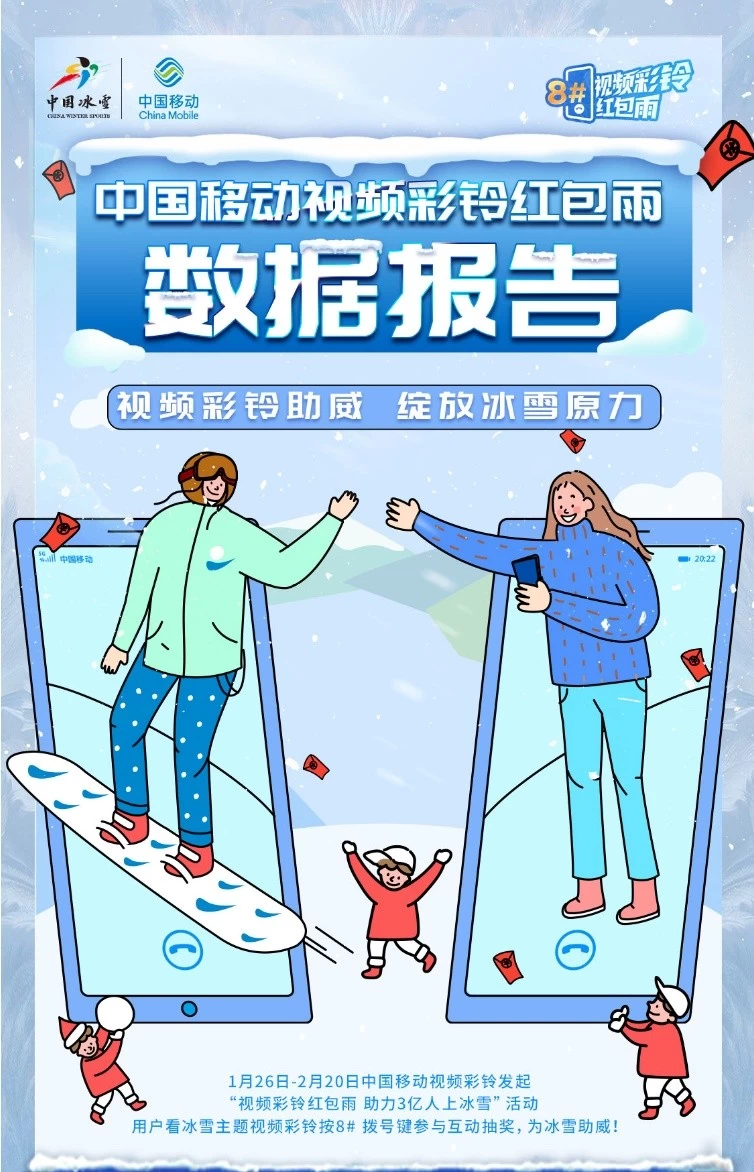 万众瞩目的北京冬奥会成功落幕,17天的拼搏与超越、欢笑与泪水在每个人心中定格。2月28日,《中国移动视频彩铃红包雨数据报告》全新出炉,充分展现了视频彩铃作为“云上冰雪场”的独特魅力。春节和冬奥期间,超6.8亿人使用中国移动视频彩铃为冰雪助力。“视频彩铃红包雨,助力3亿人上冰雪”活动更开创全新短视频社交互动玩法,8#红包雨互动人数达131万人,实现了助推3亿人参与冰雪运动的目标。