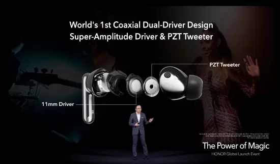 荣耀Earbuds 3 Pro是全球首款采用超大振幅动圈与陶瓷高音单元的同轴双单元TWS耳机。11mm超大振幅动圈,低音扎实有质感,澎湃有力,收放自如,不会拖泥带水,低频下潜表现更好;另一个陶瓷高音单元,则针对10k-20kHz的高频部分进行专项设计优化,有效提升高音延展性能与音乐细节表现力,传递各个乐器的自然好音色,提升高频泛音的明亮度,带来更加清澈通透的听感体验。
