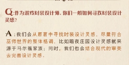 他们的猜测和脑补在最新的游戏时装设计师“温妮小裁缝”的特邀访谈中得到了印证:“哈利波特手游的时装设计灵感,会从原著中寻找,尽量符合魔法世界的整体格调,同时结合现代的审美去完善,比如暗夜庄园的设计灵感就来源于马尔福庄园。”