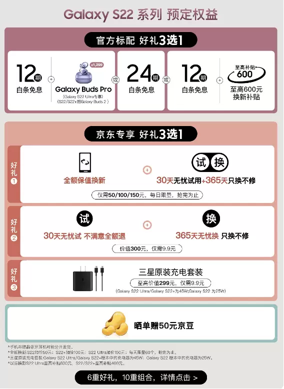 据悉,此前在京东参与预售的用户,可选择多达7种套餐,包含分期免息、30天无忧试用、365天只换不修、全额换新等权益。简单来说就是,如果30天内觉得不喜欢或者不满意,在商品完好,无任何故障的情况下都可以申请退货;如果365天内产品发生质量问题,无需担心新买的手机要维修,京东可直接换新机;而100%保值换新服务指的是,用户在新机签收后181天至450天内,购买下一代三星S系列产品时能直接全额抵扣,降低了换新成本。