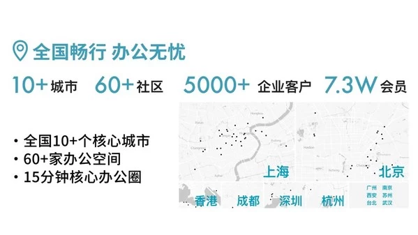 作为未来办公方式引领者,WeWork中国在全国范围内拥有80余家社区,点位遍布一、二线城市的核心地段。同时,WeWork中国拥有专业的办公场所,并提供企业级高速网络,咖啡、茶等饮品,隔音电话亭,企业级会议室及大型活动场地。专业的场地和硬件设施保证了用户办公的灵活、高效和稳定。多元化且充满设计灵感的空间,辅以高质量的服务,同时满足了用户对工作和生活的高品质追求。