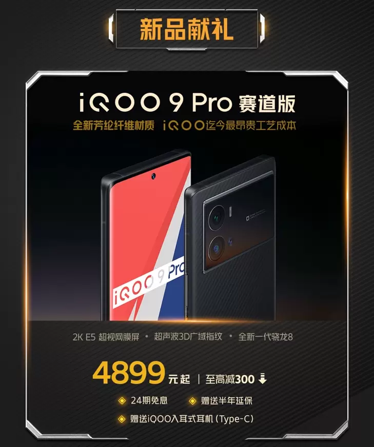 在此次三周年庆活动期间,iQOO旗下的多款热门机型都提供了丰厚的购机福利。其中应用了芳纶纤维材质3D后盖,具备出众抗冲击性能,同时还搭载了全新一代骁龙8芯片、三星E5材质2K高分辨率屏幕和超声波3D广域指纹等优秀硬件,颜值与实力俱佳的iQOO 9 Pro赛道版至高减300,到手价4899起。朋友们入手此手机时还可享24期免息,获赠半年延保和iQOO入耳式耳机(Type-C)。