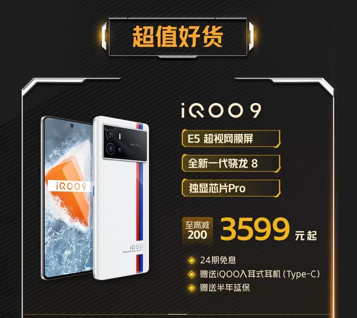 搭载了全新一代骁龙8芯片、三星E5材质屏幕和独立显示芯片Pro,具备出众游戏表现的iQOO 9至高减200,到手价3599起,下单同样可享24期免息并获赠半年延保和iQOO入耳式耳机(Type-C)。