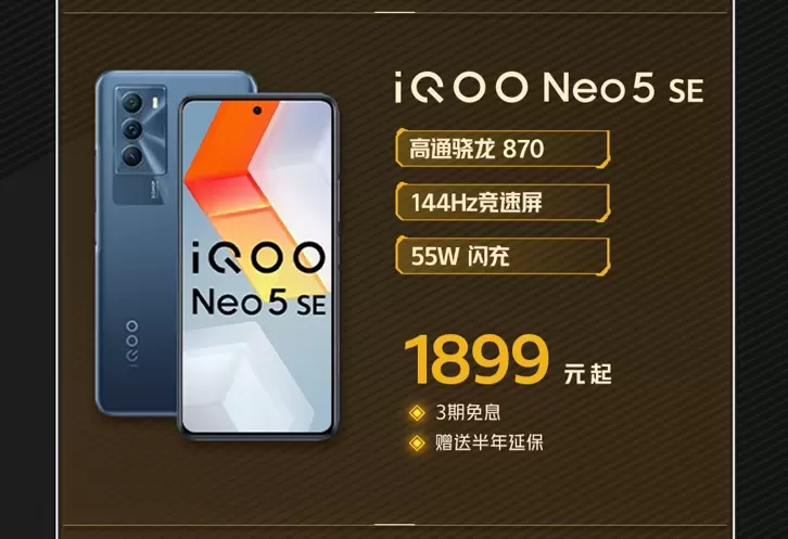 iQOO Neo5 SE是目前市场上少有的搭载了144Hz LCD材质屏幕的机型,而且它还内置了骁龙870芯片,性能表现相当不错。在活动期间,此手机到手价低至1899起,支持3期免息,还有半年延保相赠。