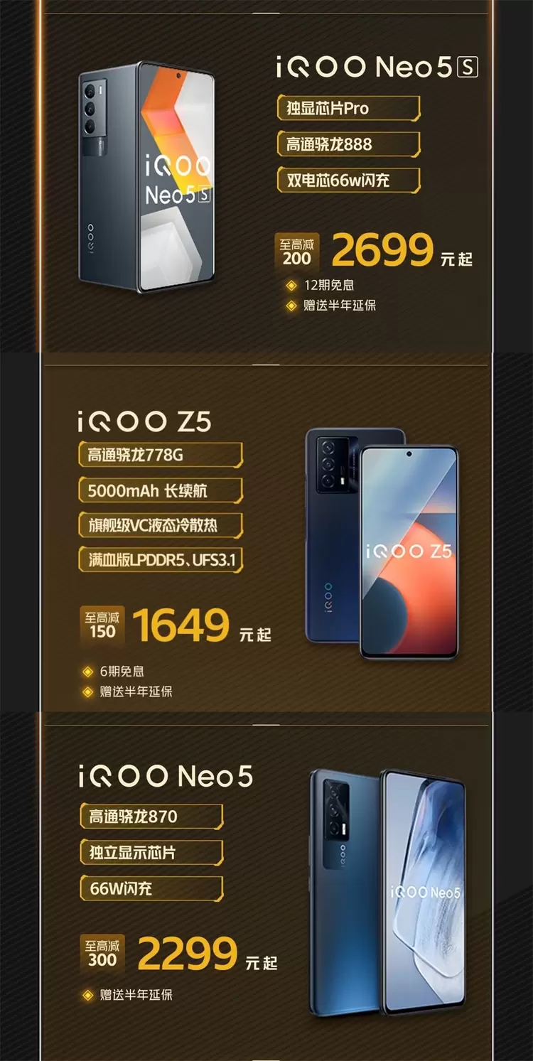 除了上面提到的这些热门机型,活动期间入手iQOO Neo5S、iQOO Z5和iQOO Neo5等产品也可享受iQOO官方提供的诸多优惠,有换机需求的朋友可以考虑一下。