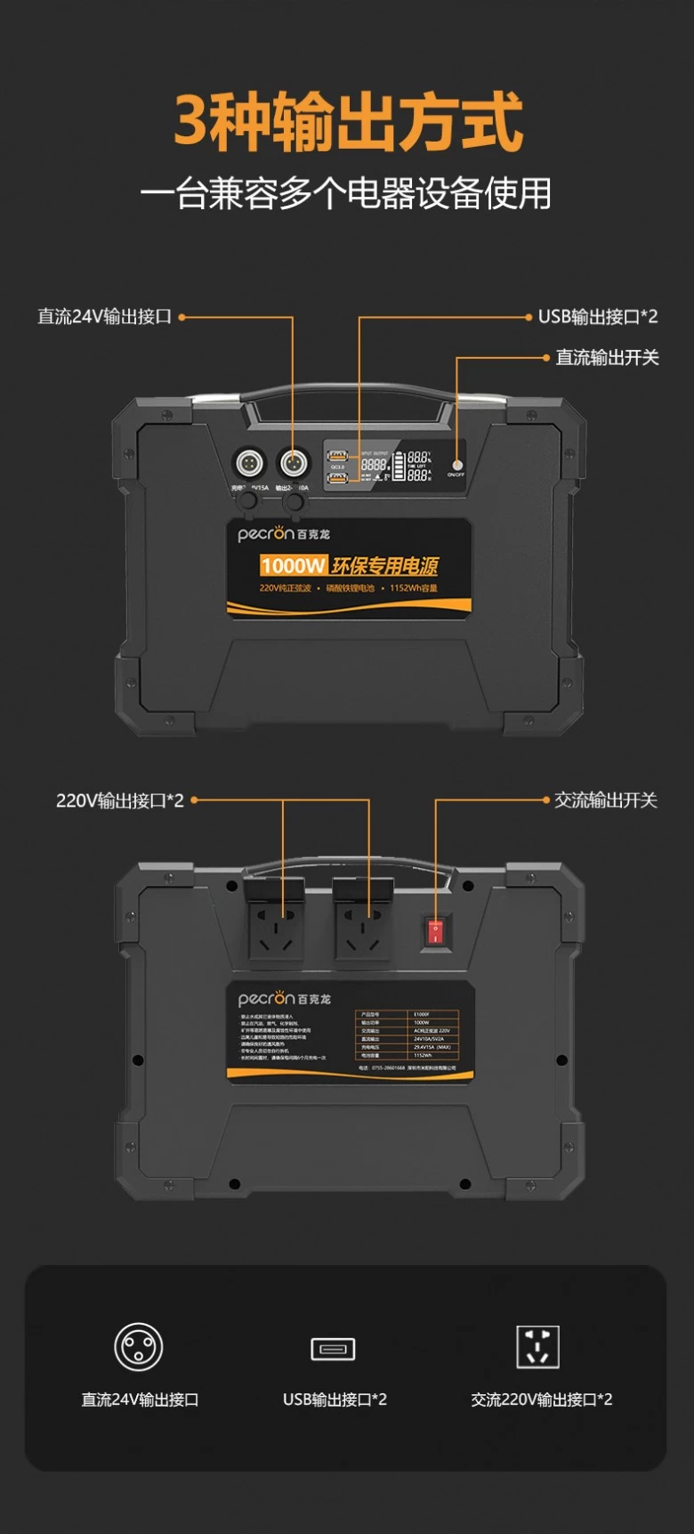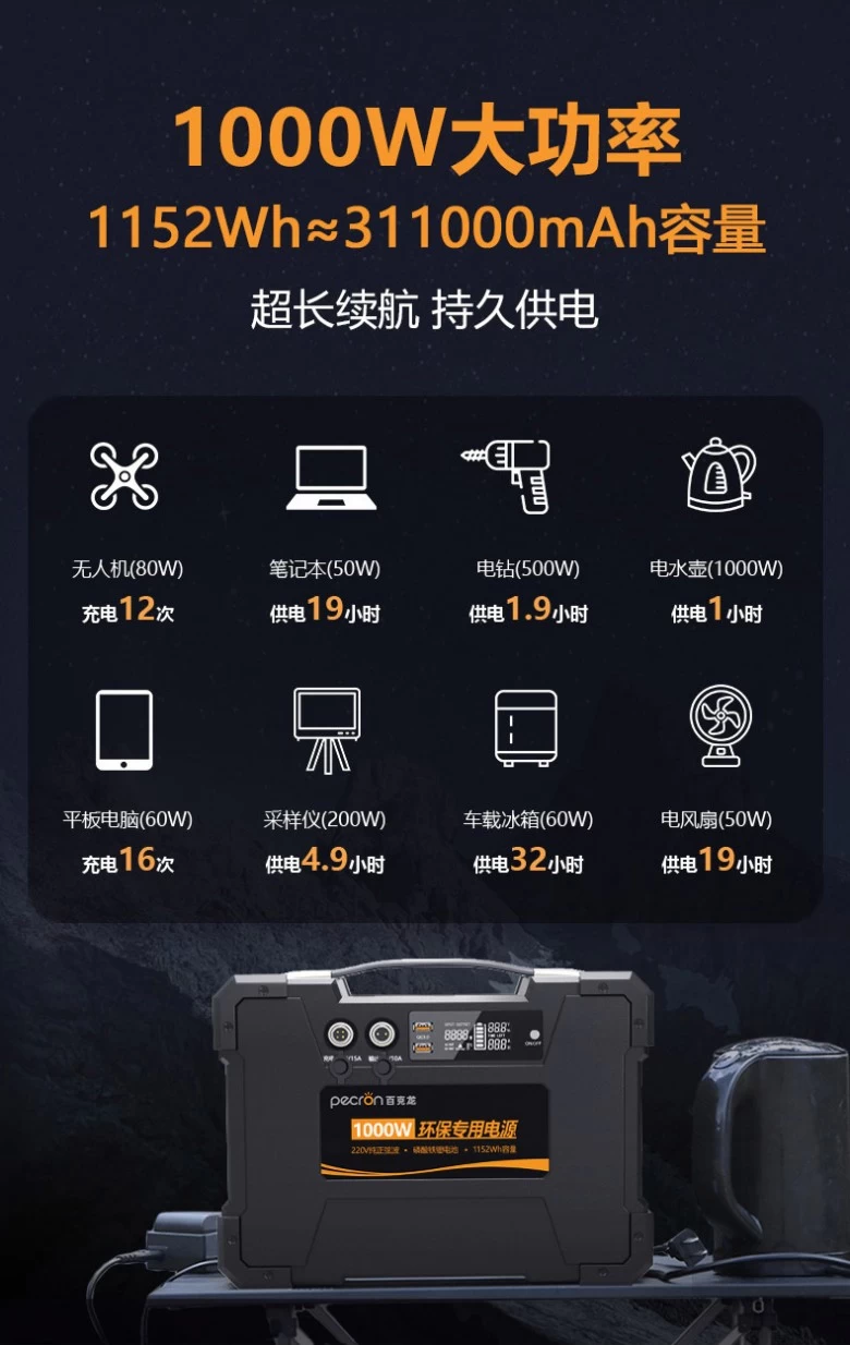 百克龙E1000F户外电源具有1000W的额定交流输出功率,峰值功率达到2000W,支持大部分电器设备使用;1152Wh的电力存储容量,能够为200W的采样仪器供电约4.9小时、笔记本供电19小时、80W无人机充电12次,真正的实现用电无忧;支持市电、车充、太阳能板三种充电方式,其中市电快充只需要3-4小时即可充满;搭配3种输出端口,支持220V纯正弦波输出、USB QC3.0输出、DC输出,兼容多个设备同时使用。