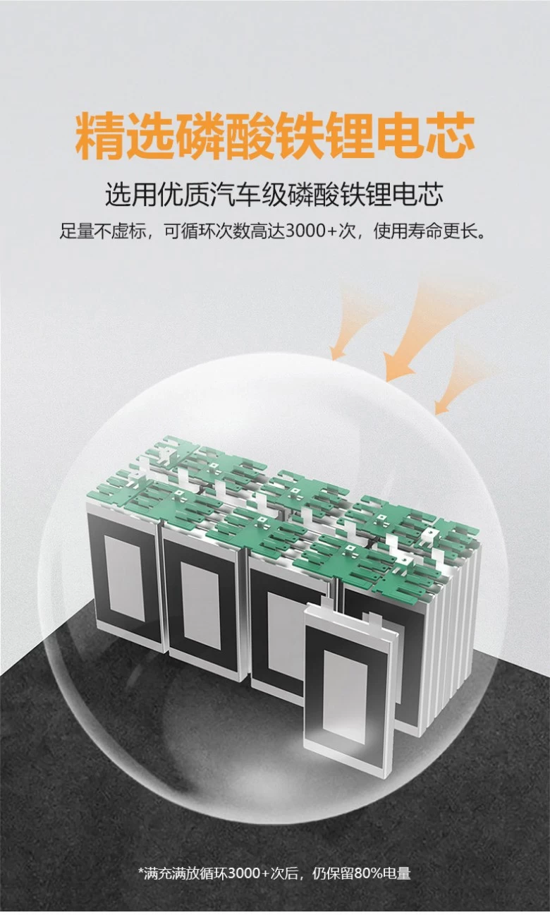 精选磷酸铁锂电芯,使用寿命高达3000次+