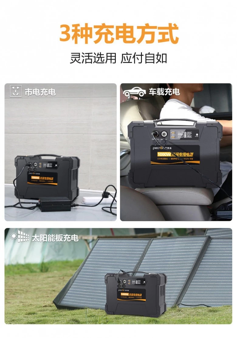 为了能够实现随时随地都有电,百克龙E1000F户外电源有着三种充电方式,支持220V市电充电,只需要3-4小时就能够至100%;支持36V太阳能板充电,只要有光就能保证电力不断;支持车载充电器充电,在路上也可以为电源续航。
