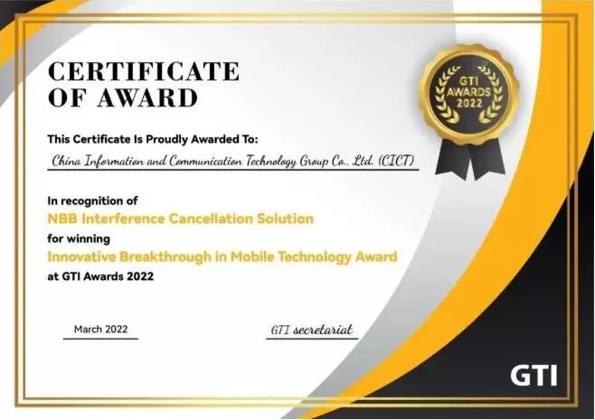 中国信科“NBB干扰消除方案”荣获GTI“移动技术创新突破奖”