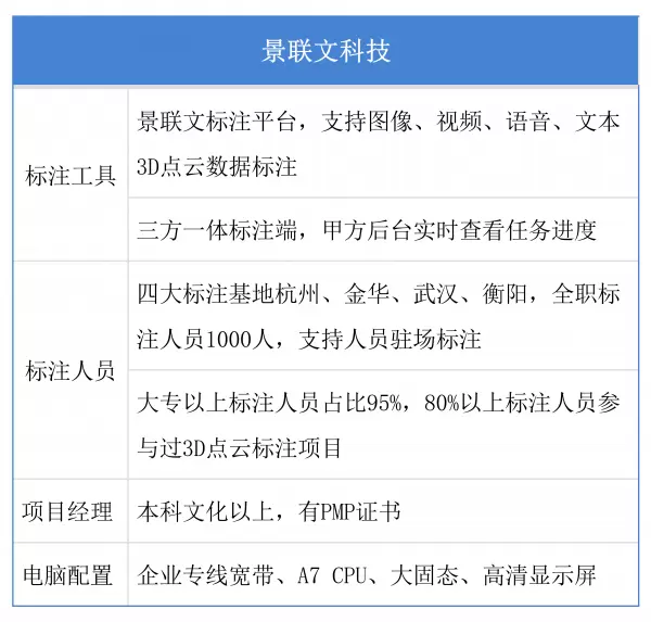 自动驾驶领域标注项目数据量和单个数据文件普遍较大,对数据精度的要求更高,因此对外包数据公司的标注团队规模、自动驾驶项目执行经验、服务器、平台的承载能力有着更高的要求。景联文科技在全国拥有四个大型标注基地,为1000+数据标注师提供综合标注技能培训,通过项目轮转形式使90%以上标注人员执行过自动驾驶场景标注项目,选择大专以上学历且对自动驾驶算法需求有一定理解能力的标注师专门负责2D3D融合等高难度标注项目,同时对标注平台服务器、企业专线宽带、办公电脑配置进行全面升级,支持对大量数据同时进行标注操作并保证其加载速率。