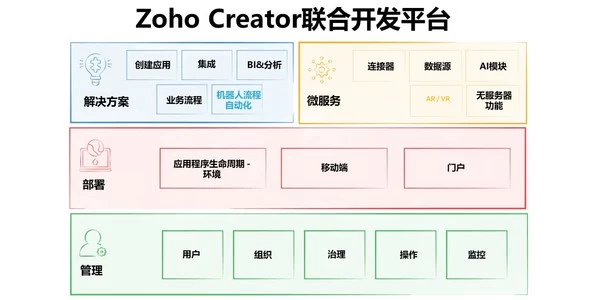 近日,全球领先的云计算公司ZOHO发布了新一代低代码工具 -- Zoho Creator联合开发平台,其功能扩展到涵盖解决方案的开发、部署和管理三个阶段,旨在通过一站式低代码解决方案帮助企业/组织探索新的业务解决途径。