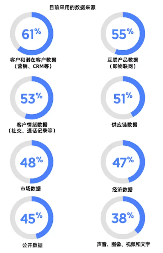 根据Cloudera报告中的统计,目前企业获得数据的来源主要来自于客户数据,其中包括了营销数据、服务数据,以及客户关系管理数据。第二类是物联网及智能产品的数据,IoT设备及配套的程序正在产生大量数据。第三类是客户情绪数据,主要来自于微信朋友圈、微博这样的社交平台。此外还有供应链数据与物流数据,包括生产过程中的上下游状况,或是销售过程中门店通过代理商铺货过程中产生的数据。