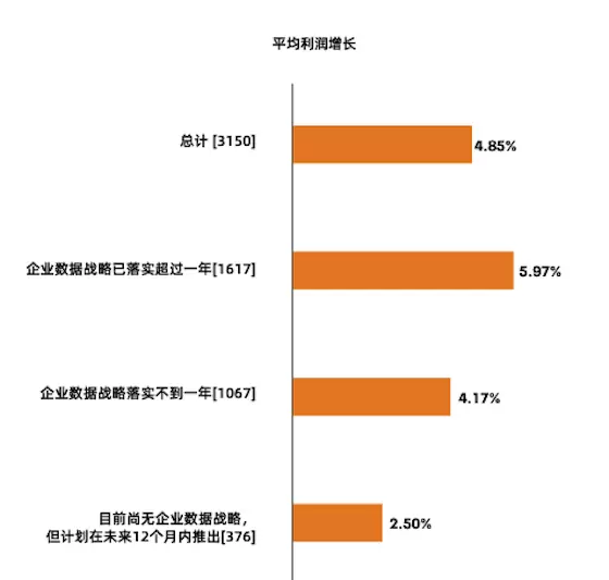 更重要的是,数据战略更成熟的企业能够实现更强劲的利润增长,在提高有效性的基础上,数据战略实施一年以上的企业所报告的利润增长高于较晚实施和计划在未来12个月内实施的企业。错失与数据相关的机会可能会造成经济损失。为了避免这种情况,当务之急是制定有效的战略来管理数据。那些制定了路线图和明确目标的企业将获得经济回报。根据与企业的调查,有96%的业务决策者都同样大数据战略对于业务产生了很大价值。