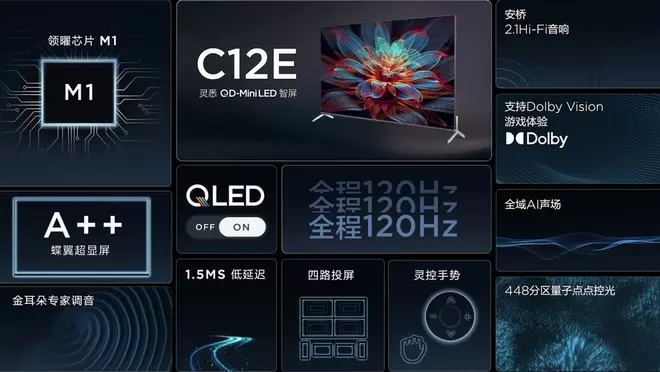 TCL灵悉QD-Mini LED智屏C12E是去年C12的升级款,同样搭载第三代QD-Mini LED以及安桥Hi-Fi音响。尤为值得一提的是TCL C12E是首台经过Dolby Vision Gaming(杜比视界游戏)认证的QD-Mini LED智屏,可以畅玩支持杜比视界的3A游戏大作,能达到行业极限的1.5ms低延迟输入,同时还支持HDR 10+、Dolby Vision等格式的电影和游戏,带来超清流畅超低延迟的观影游戏体验,非常适合年轻有品质的用户群体使用。